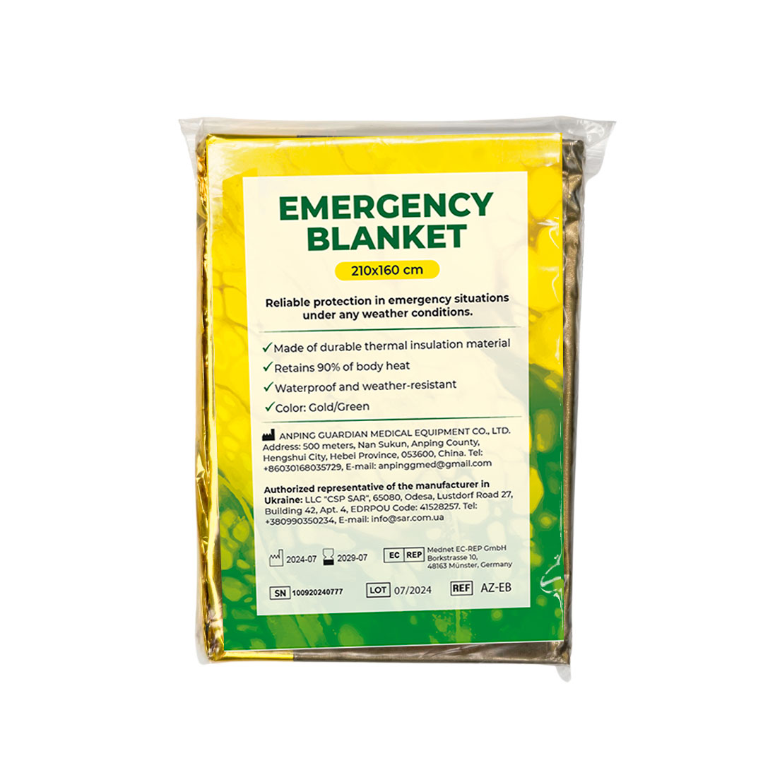 Thermal blanket is a thin PET film covered on different sides with metallized gold and green coating. The life blanket (thermal blanket) is a protective blanket for keeping warm in extreme conditions. Made of material that retains up to 90% of heat, it is compact and lightweight, suitable for emergencies, hiking and outdoor activities. The rescue blanket is a thin PET film coated on different sides with gold and green metallized coating, as a result of which it reflects up to 80% of the heat radiated by the body and allows to maintain the necessary thermoregulation. In addition to its light weight and water and airtight properties, the blanket is highly durable and can be used for transportation of the injured person.