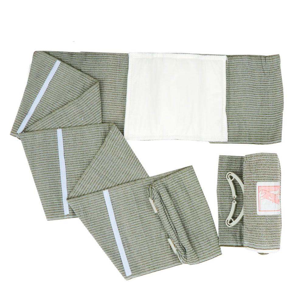It consists of a 15 cm*1.5 m elastic bandage sewn with a 15*17 cm cushion made of absorbent fabric, the main task of which is to absorb blood. The bandage with one pillow is easy to use and intuitive for both professionals and untrained people. The bandage has a special hook to secure it, which frees your hands and allows you to perform other life-saving activities. Plastic fixators are used to apply additional pressure to the wound and fix the elastic bandage. The main advantage of the bandage is that it is stitched with thread along the entire length and has additional Velcro placed along the entire length of the bandage at regular intervals to prevent uncontrolled unwinding.